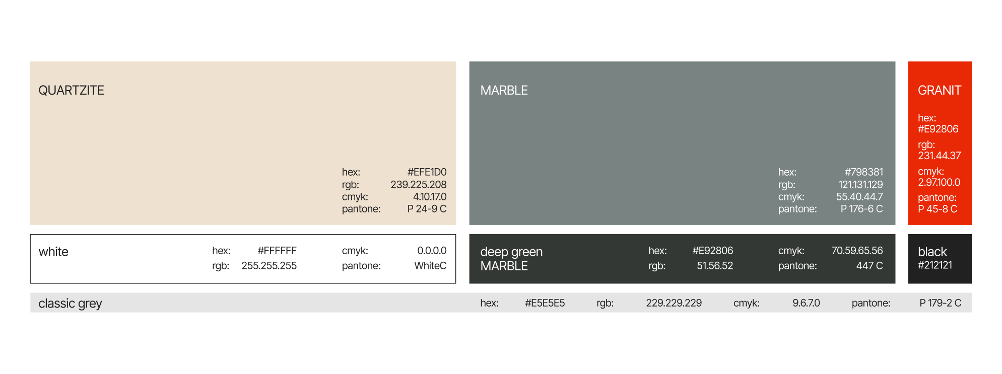 For the color palette, I drew inspiration from the natural beauty of stone. Deep gray and greenish marble tones evoke harmony, stability, and reliability, while red-orange granite accents add warmth and energy, creating a striking visual contrast. Light quartzite tones bring a touch of elegance and nobility, completing the palette. Together, these colors not only highlight the unique shades of natural stone but also convey the durability, strength, and timelessness of KAM’s products.